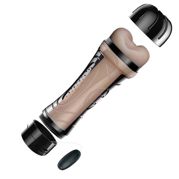 Deslize o pênis ereto dentro do masturbador. Gire o botão para ligar/desligar e controlar a intensidade de vibração.