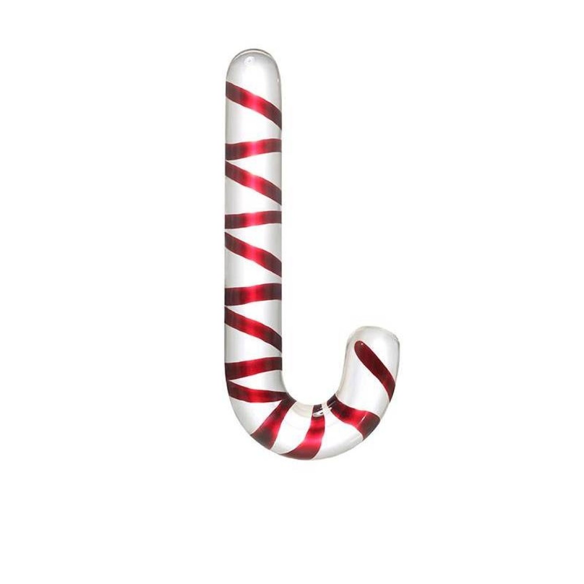 Plug anal em vidro formato bengala natalina com detalhe espiral vermelho.