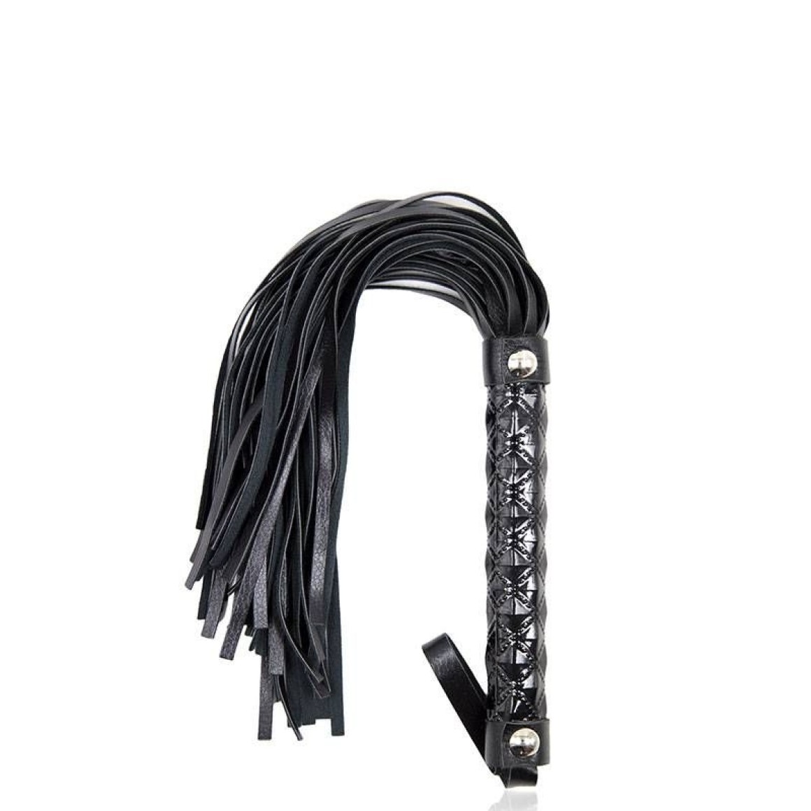 Chicote com franja, acabamento brilhante em alto relevo e alça para punho.