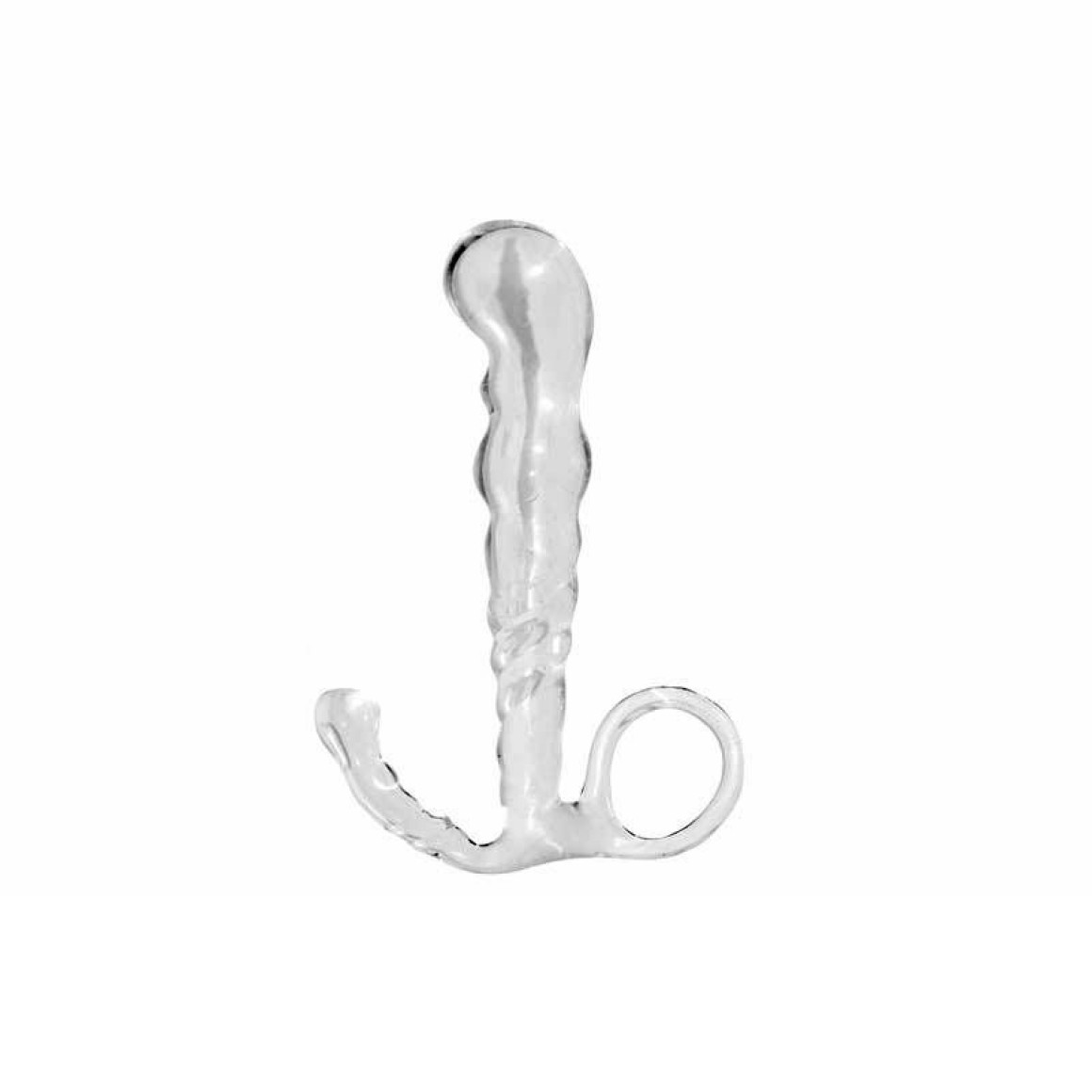 Massageador de próstata com diâmetro escalonado, alça de segurança e estimulador perineal.