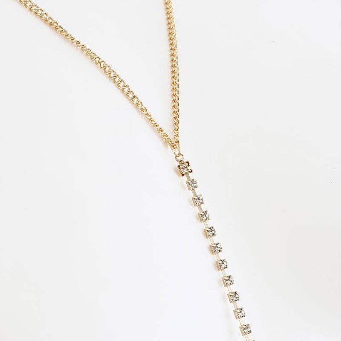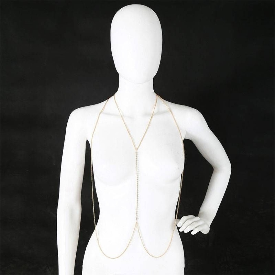 Colar de corpo com corrente dourada e detalhe central com pérola.