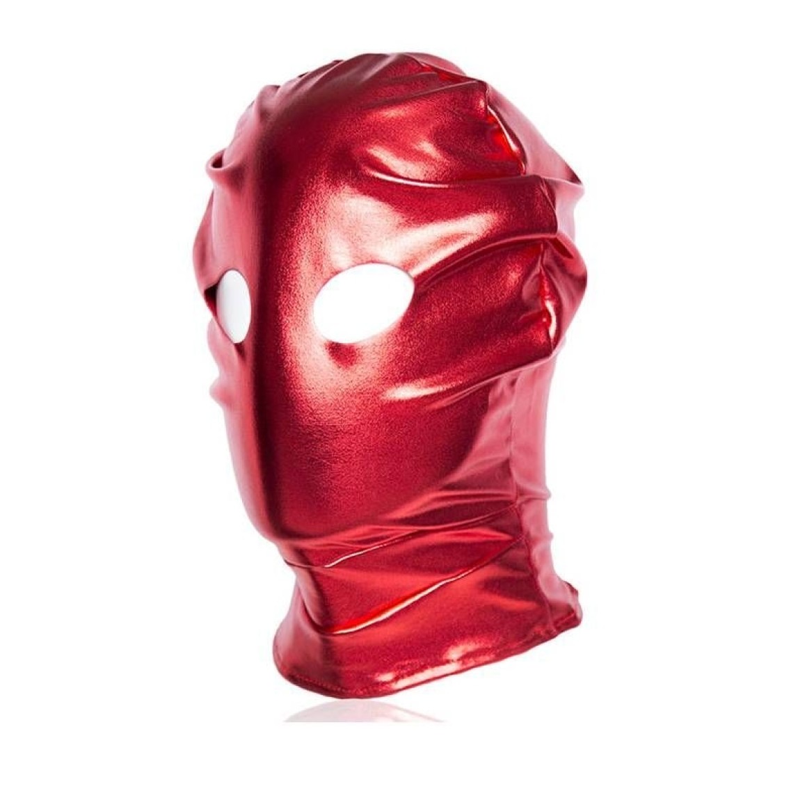 Capuz com abertura na região dos olhos e fechamento com zíper traseiro.