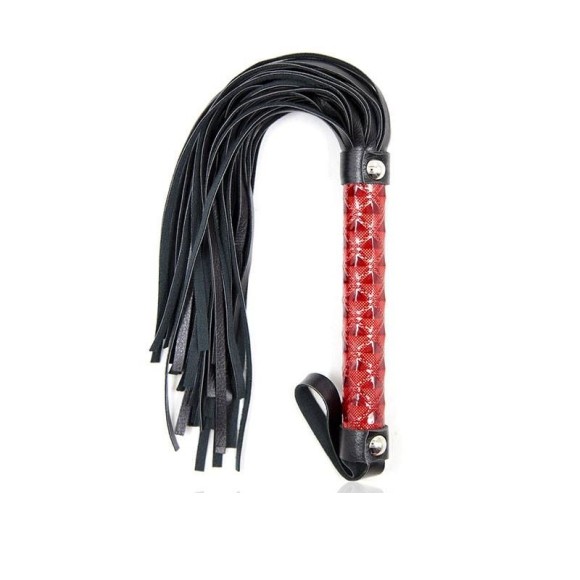 Chicote com franja, acabamento brilhante em alto relevo e alça para punho.