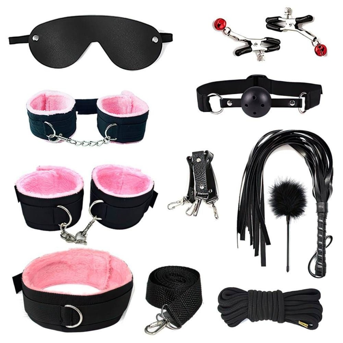 Kit Sado Bondage com 10 Peças: Mordaça, venda, coleira com guia, chicote, algemas, tornozeleiras, cruz de restrição, corda de 5 m, pluma e prendedores de mamilos. Acabamento confortável e materiais resistentes (PU, pelúcia, metal). Ideal para experiências BDSM com segurança, estilo e intensidade.