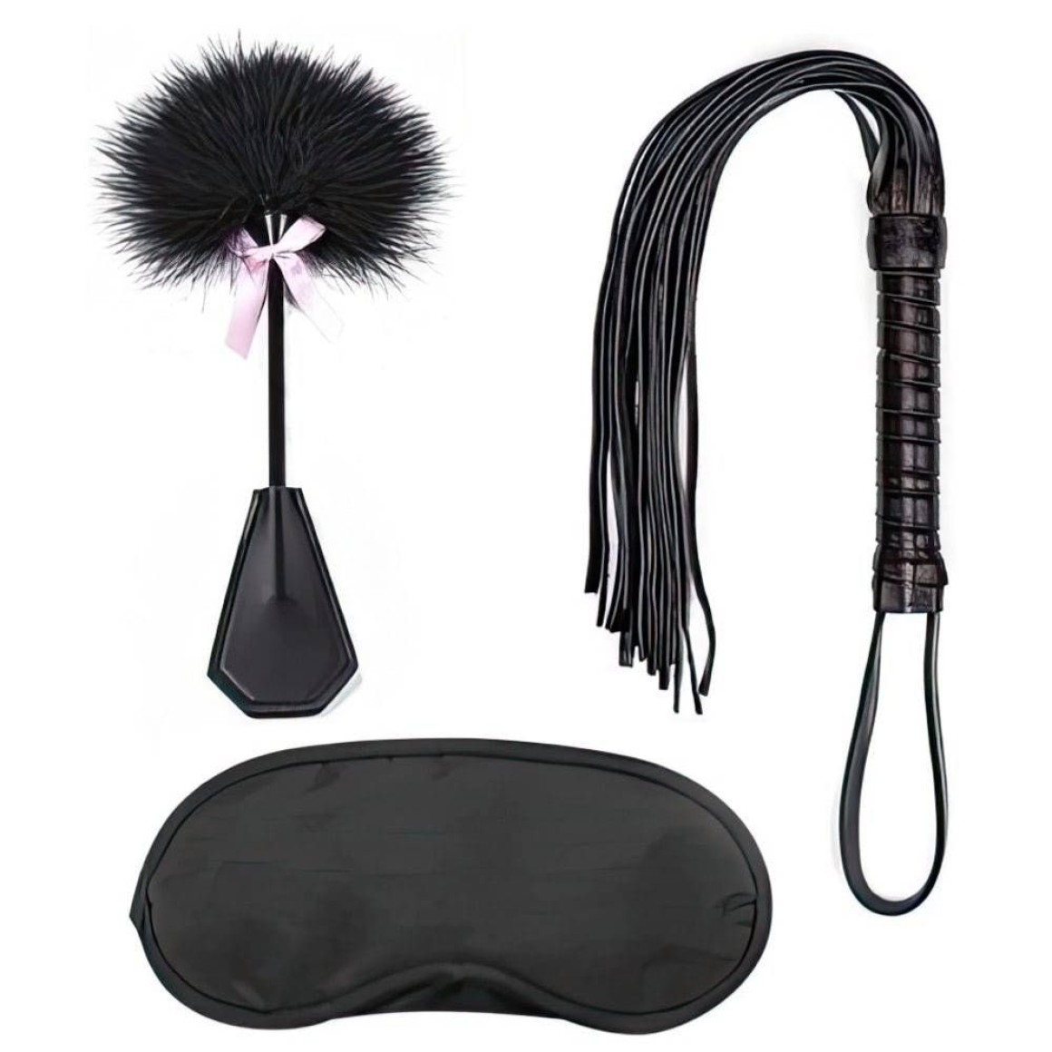 Este kit é composto por três itens essenciais: um chicote de couro, uma máscara e um acessório de estimulação.