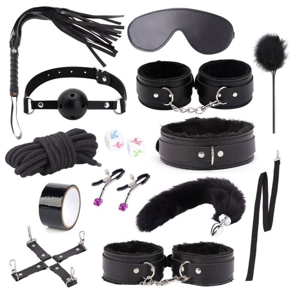 • Inclui um chicote de franjas para estimulação, fita adesiva para imobilização, prendedores de mamilos com sinos para novas sensações, dados eróticos para brincadeiras divertidas, uma pena de estimulação para toques suaves, cruzetas de imobilização para restrição segura, um plug anal com cauda de raposa para um toque de fantasia, cordas para amarração versátil, uma venda para privacidade e intensidade, uma mordaça com bola,uma coleira para dominação, algemas de mão e tornozelo para imobilização confortável, e uma coleira com guia para conexão e controle.