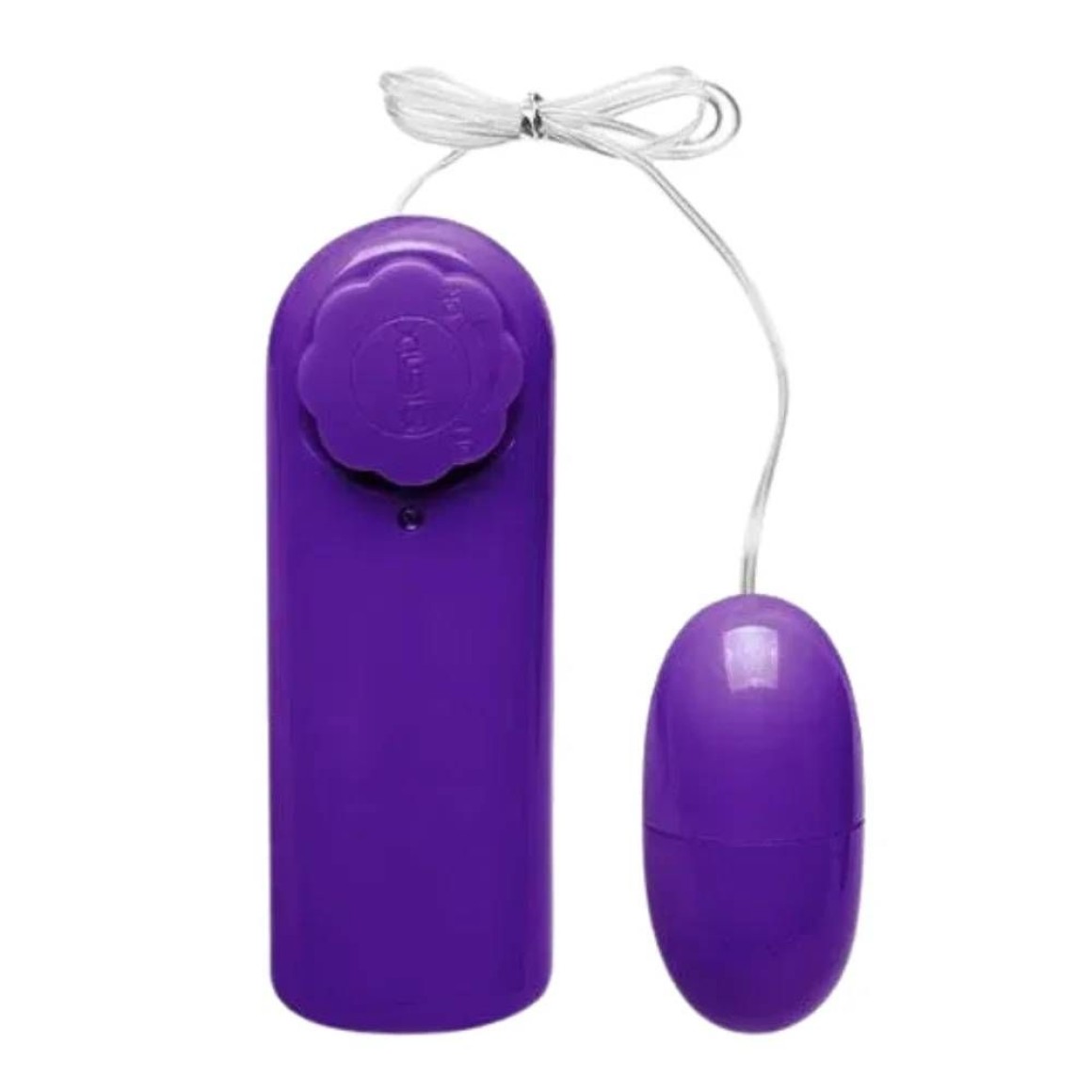 Cápsula vibratória bullet em formato bala com controle remoto com fio, tendo um único botão giratório para o controle da vibração.