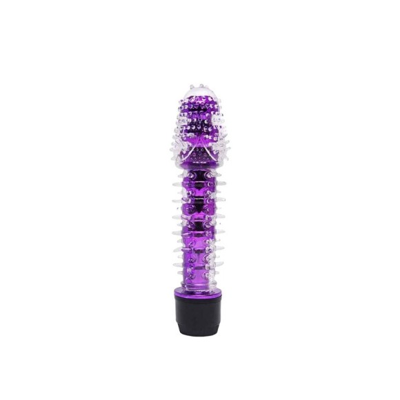 Vibrador personal com capa texturizada. Possui superfície lisa e um motor multivelocidade controlado a partir de um botão giratório em sua base.
