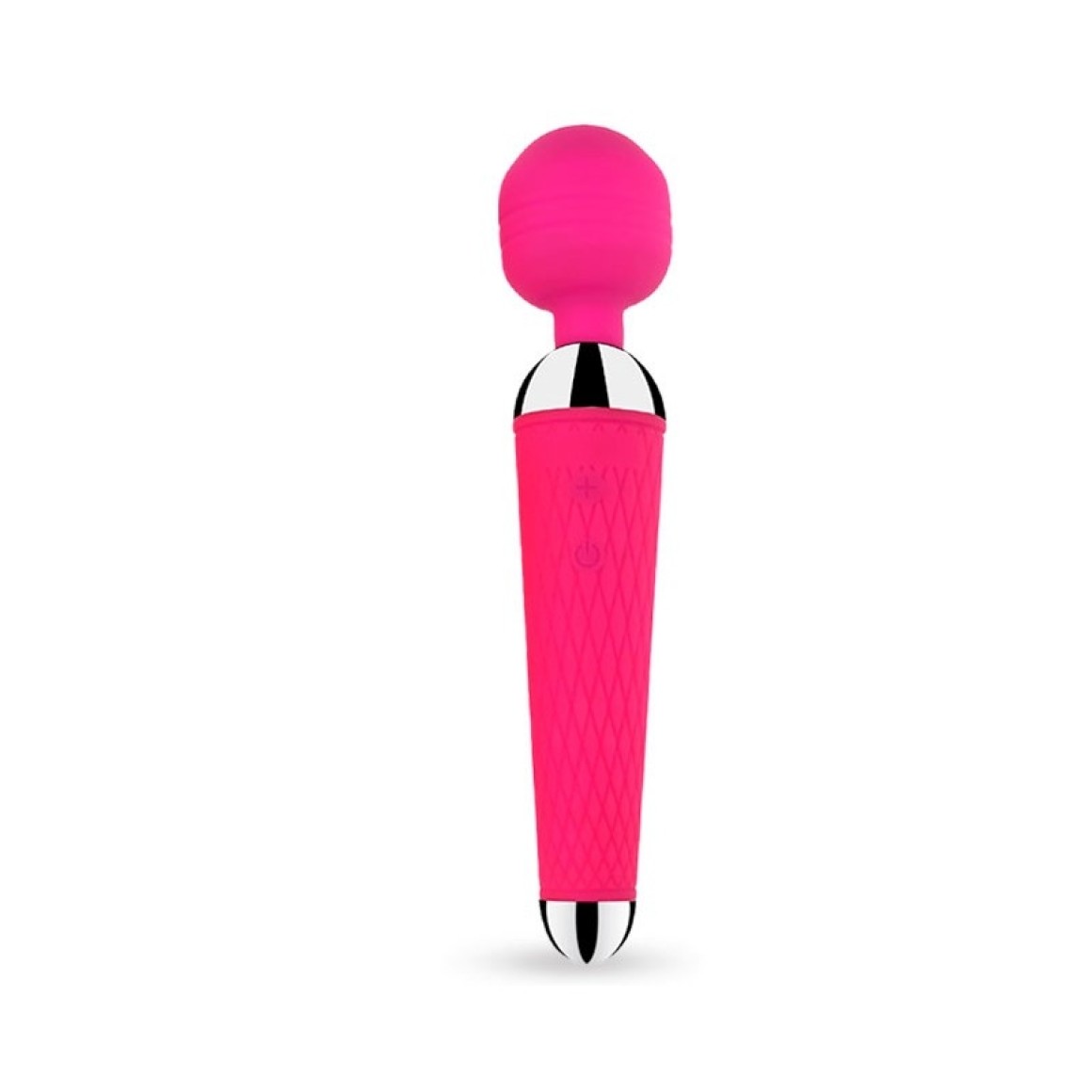 Massageador recarregável corporal em silicone, com formato ergonômico, corpo texturizado com detalhes metálicos e cabeça flexível. Possui 10 modos de vibração.