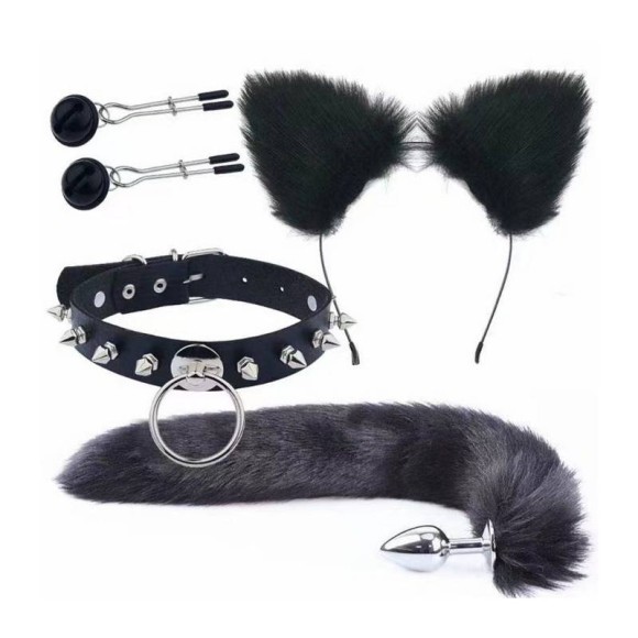 Kit fox composto por 1 tiara de pelúcia, 1 plug anal com cauda, 1 prendedor de mamilo com sino e 1 coleira com spikes.