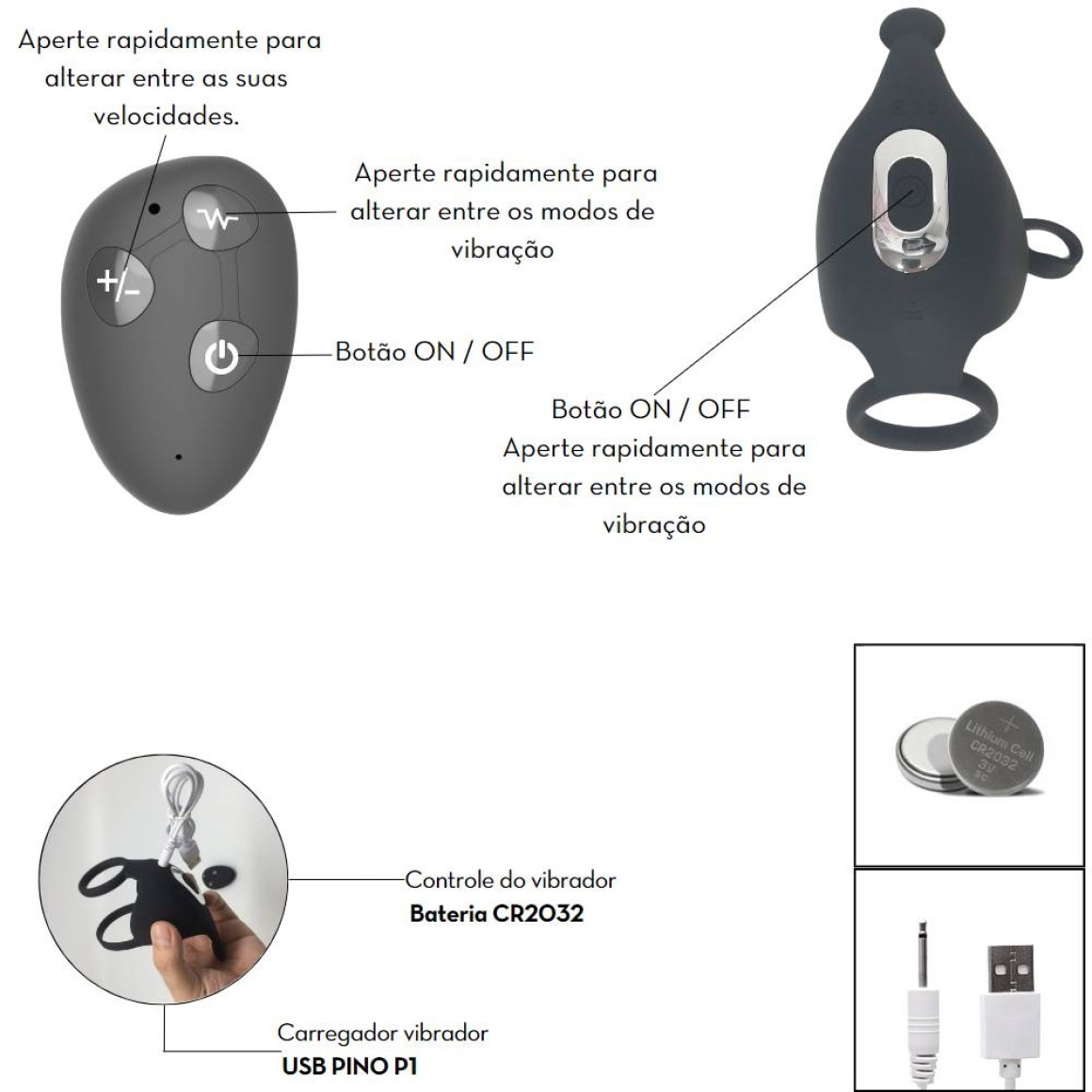 Bateria: Massageador: Recarregável USB (cabo incluso) / Controle: 1 Bateria CR2032 (inclusa)