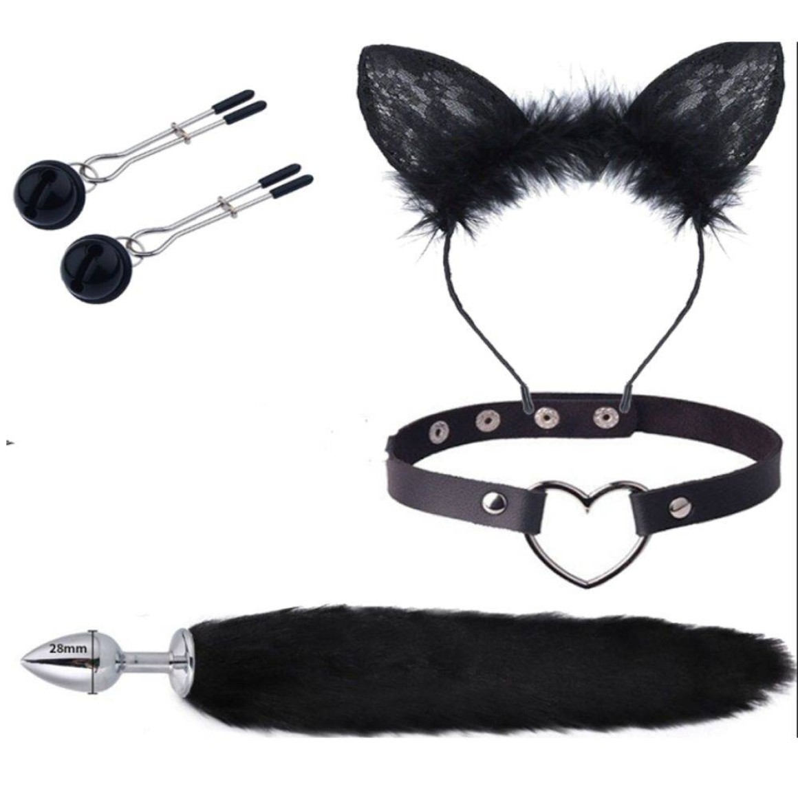 Medidas aprox.: Tiara – 185 x 11 mm / Plug – 460 x 7 x 28 mm / Prendedor – 61 mm / Coleira – 390 mm