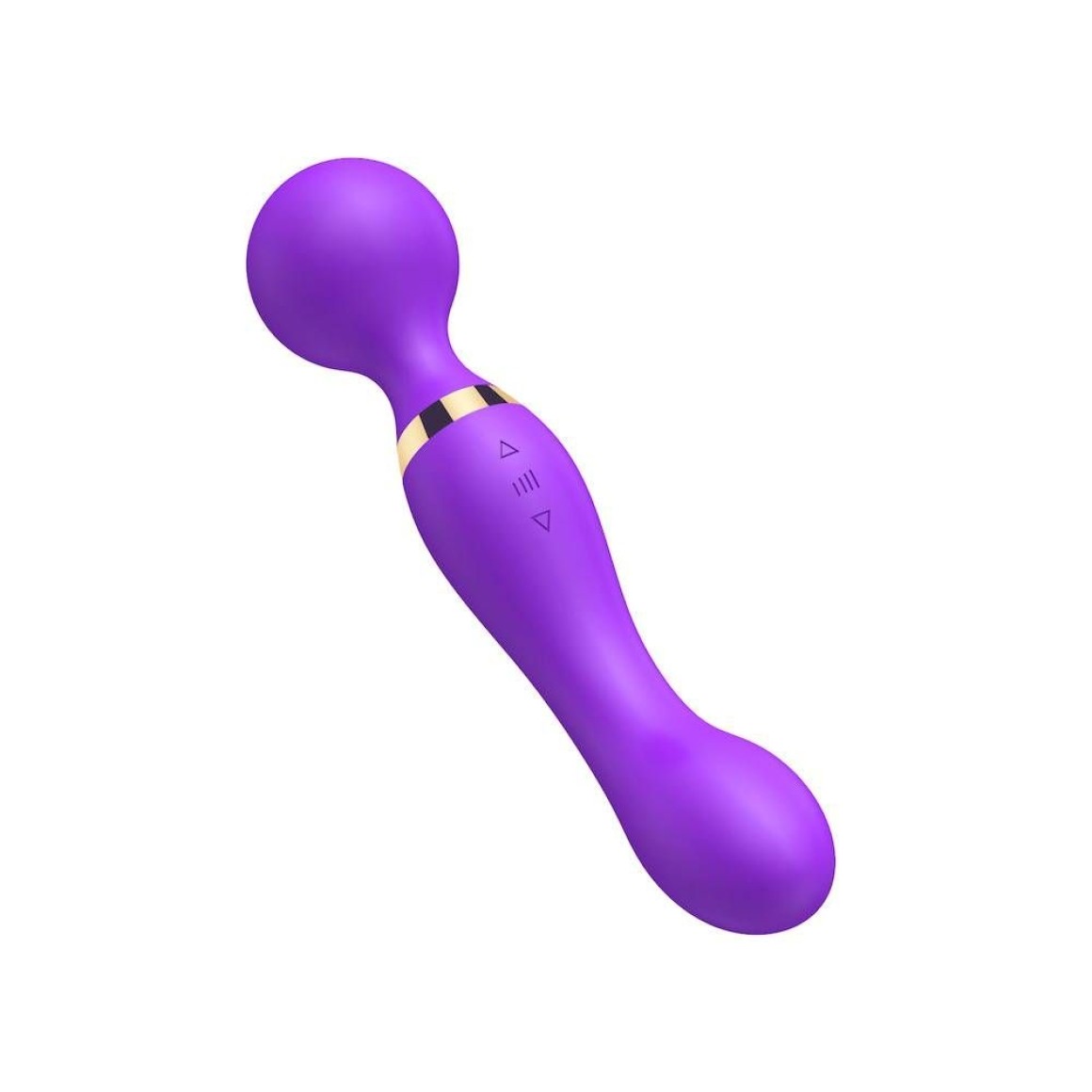Vibrador com dupla estimulação, sendo em uma ponta um vibrador ponto G e na outra ponta um potente massageador corporal, controle de fácil acesso.